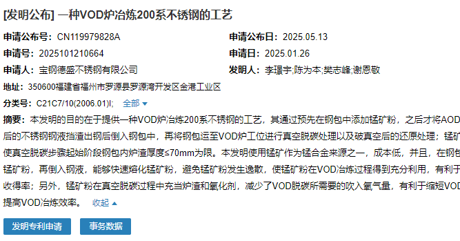 2025年5月13日,寶鋼德盛不銹鋼有限公司成功申請一項名為“一種VOD爐冶煉200系不銹鋼的工藝”專利,申請公布號為CN119979828A,申請日期為2025年1月26日。