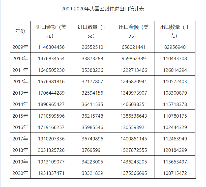 我國密封件行業經過不斷發展,現階段已經取得了長足進步,生產的產品基本可以滿足國內需求,成為我國機械工業發展所需的重要基礎產業。數據顯示,2020年我國密封件產量為159.45萬噸,同期進口數量為3.33萬噸,出口數量為10.87萬噸,我國密封件表觀消費量為151.91萬噸。