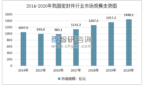 2014年我國密封件市場規模為1047.9億元,2020年我國密封件市場規模增長至1448.2億元,2014年以來我國密封件行業規模復合增速為5.54%。