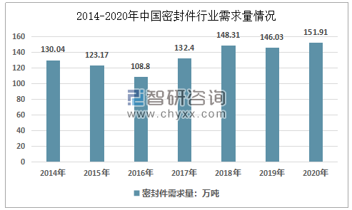 2020年我國密封件行業需求量151.91萬噸,同比2019年的146.03萬噸增長了4.03%,近幾年我國密封件行業需求量情況如下圖所示: