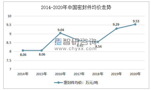 近幾年我國密封件市場均價總體保持波動上行態勢,行業市場價格波動主要受經濟運行的景氣程度,原材料價格波動,已經相關政策影響,同時下游各主要行業景氣程度,產品的需求結構對行業產品價格走勢也有較大的影響。數據顯示,2019年我國密封件均價為9.29萬元/噸,2020年增至9.53萬元/噸。